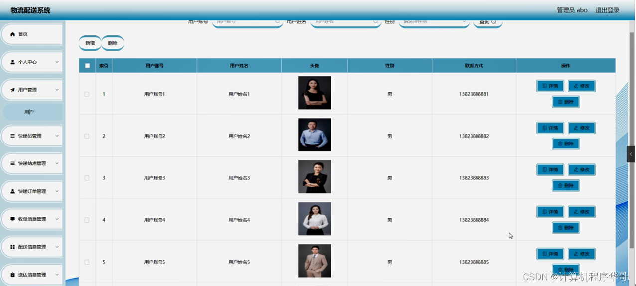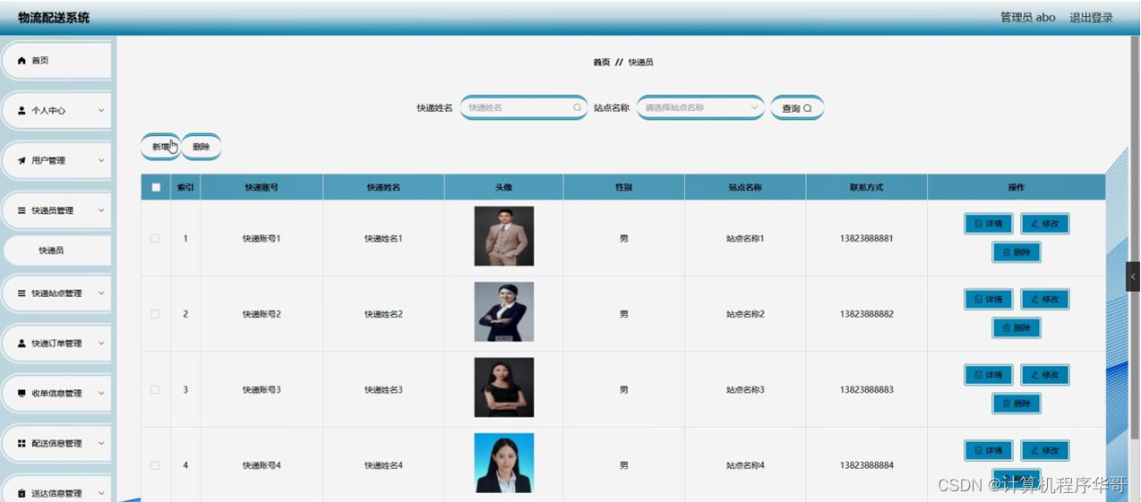 快递员管理,在快递员管理页面可以对索引、快递账号、快递姓名、头像、性别、站点名称、联系方式等内容进行详情,修改和删除等操作,如图5-4所示。