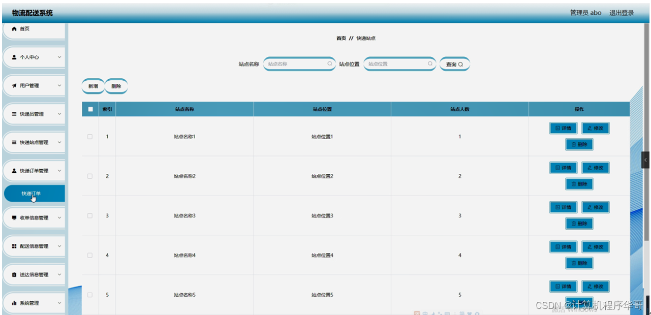 快递站点管理,在快递站点管理页面可以对索引、站点名称、站点位置、站点人数等内容进行详情,修改和删除等操作,如图5-5所示。