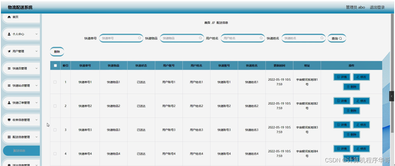 配送信息管理,在配送信息管理页面可以对索引、快递单号、快递物品、快递状态、用户账号、用户姓名、快递账号、快递姓名、更新时间、地址等内容进行详情,修改和删除操作,如图5-8所示。