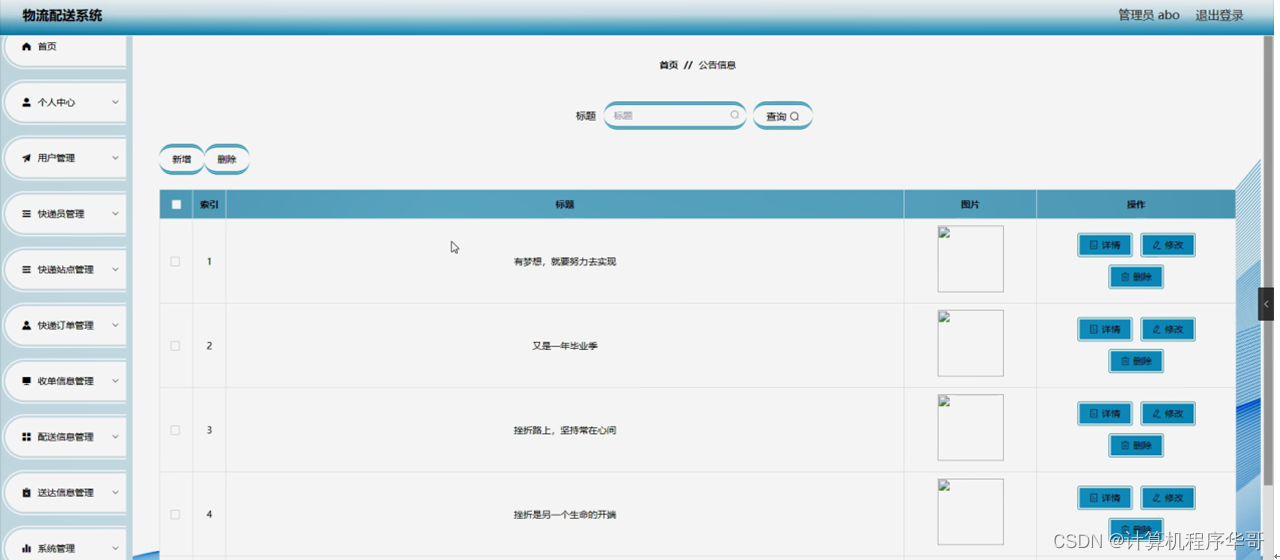 系统管理,在公告信息页面可以对索引、标题、图片等内容进行详情,修改和删除等操作;如图5-10所示。