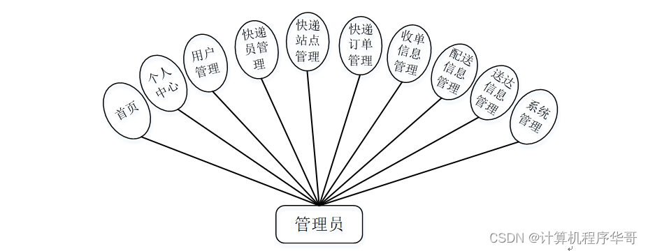 管理员登陆后,主要包括首页、个人中心、用户管理、快递员管理、快递站点管理、快递订单管理、收单信息管理、配送信息管理、送达信息管理、系统管理等功能。管理员用例图如图3-1所示。