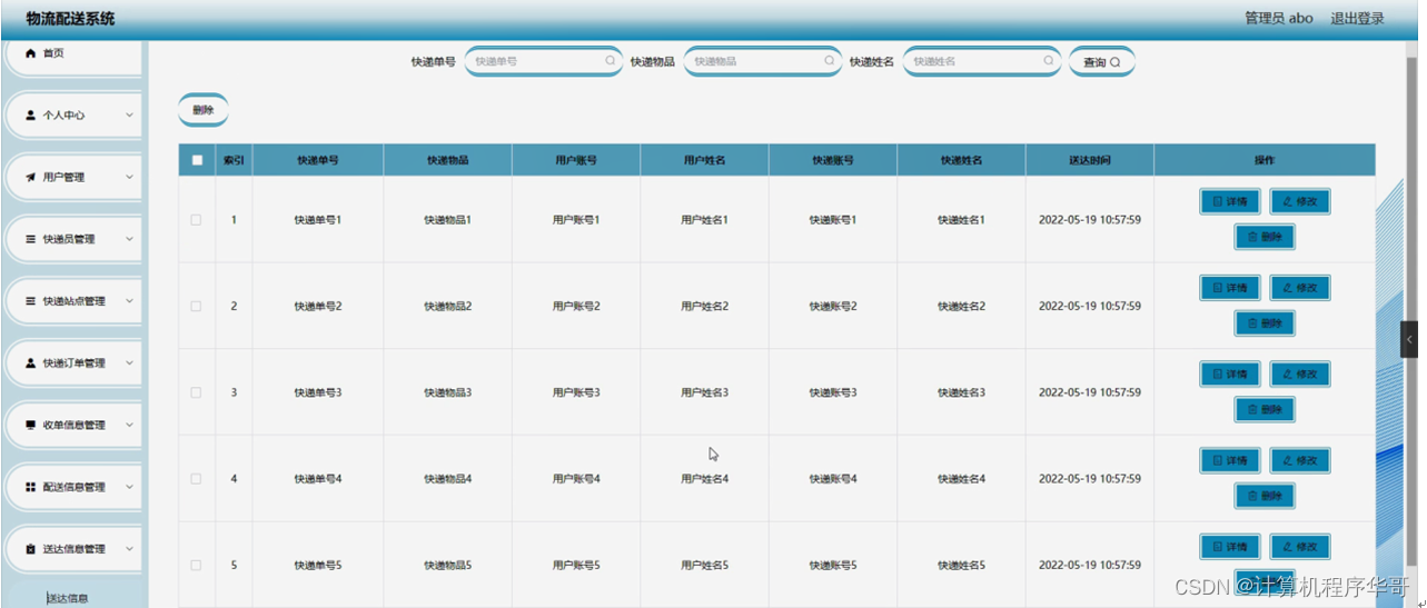 送达信息管理,在送达信息管理页面可以对索引、快递单号、快递物品、用户账号、用户姓名、快递账号、快递姓名、送达时间等内容进行详情,修改和删除等操作,如图5-9所示。