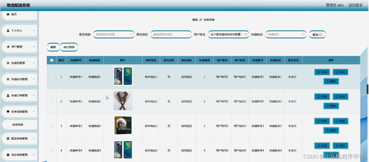 收单信息管理,在收单信息管理页面可以对索引、快递单号、快递物品、图片、收件地址、是否违禁、寄往地区、快递费用、用户账号、用户姓名、快递账号、快递姓名、是否支付等内容进行详情,修改和删除等操作,如图5-7所示。
