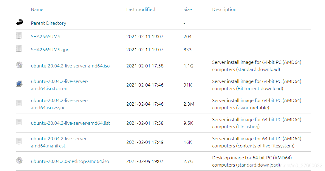 LTS(Long-Term Support)是长期技术支持版,提供长期的硬件支持更新,软件更新和安全更新等服务,而没有LTS的版本技术支持为18个月。除了更新支持时间长短外,LTS和非LTS版本没有任何区别。点击想要下载的版本(本文使用的是Ubuntu20.04.2.0LTS版本),下滑找到iso文件的下载地址。