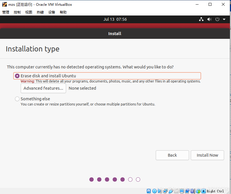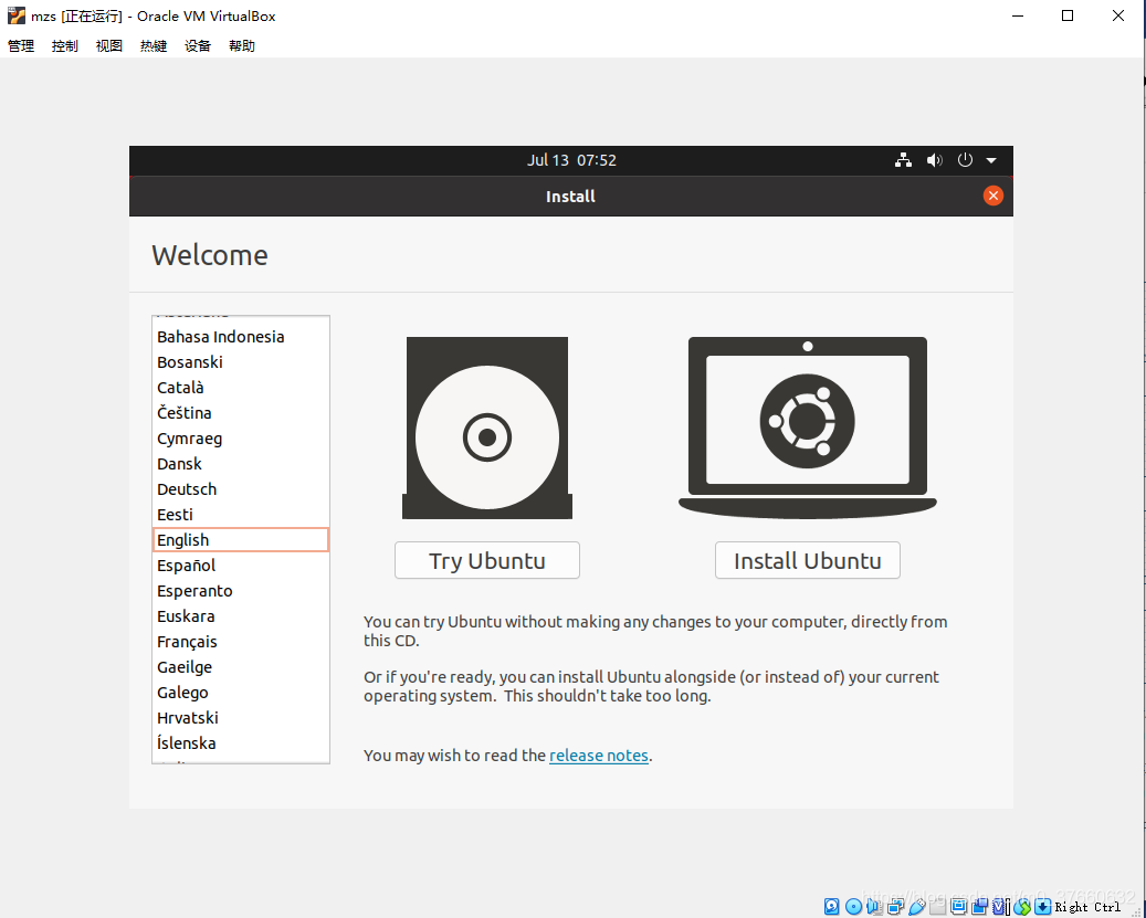选择英文,然后选InstallUbuntu(按右ctrl可以在虚拟机和本机之间切换)