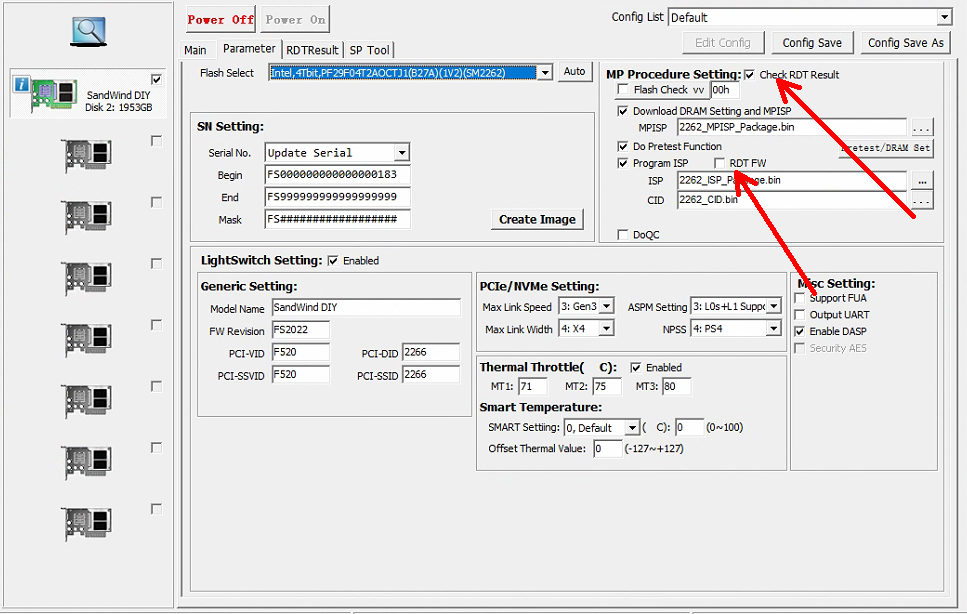 好的,到此RDT设置就算设置完了,记得全部都保存,接下来我们开卡!上面已经给出了量产部落网的2262en下载地址。