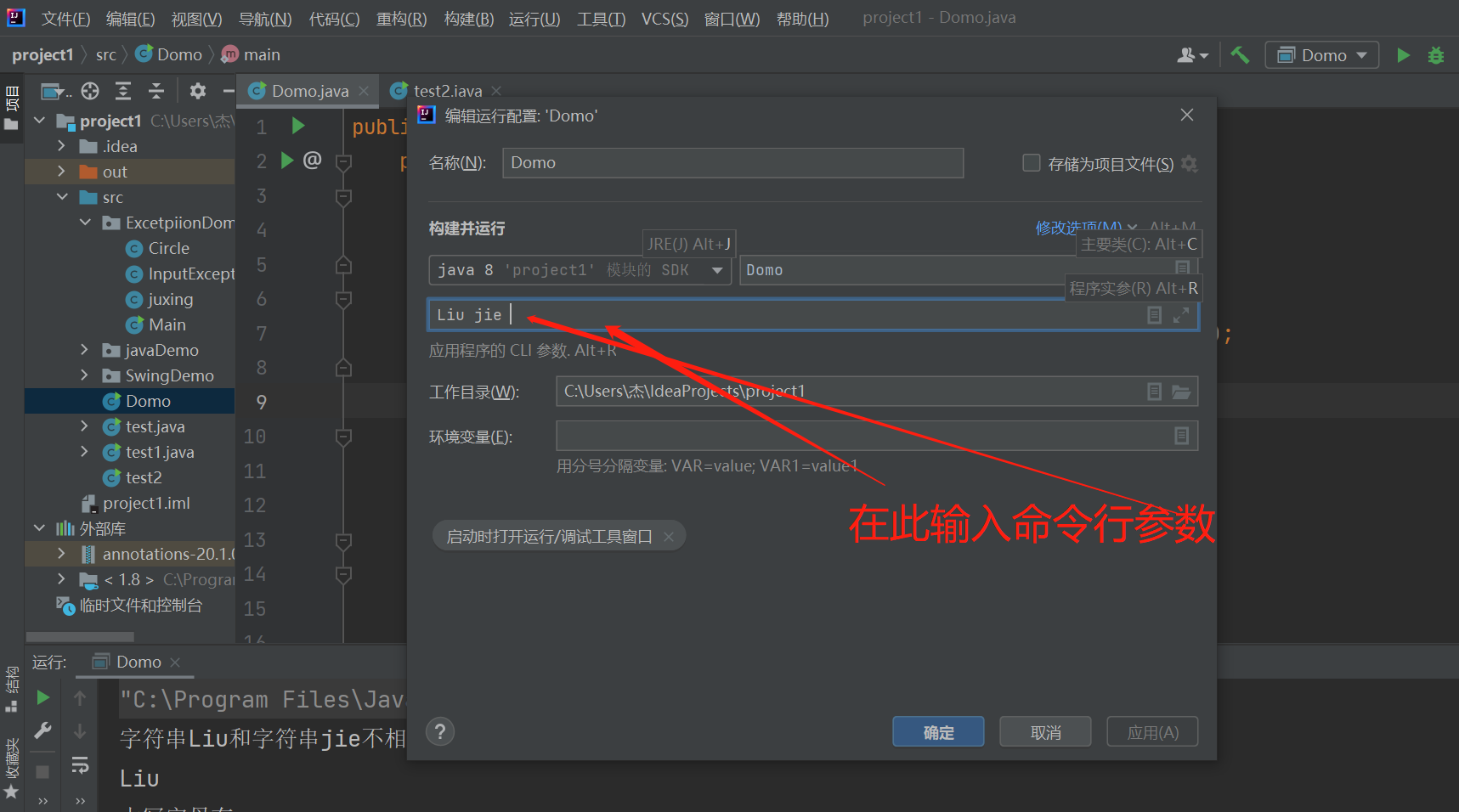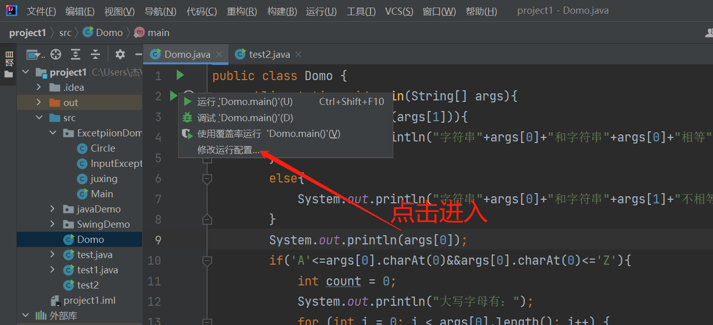 public class Domo {public static void main(String[] args){if(args[0].equals(args[1])){System.out.println("字符串"+args[0]+"和字符串"+args[0]+"相等");}else{System.out.println("字符串"+args[0]+"和字符串"+args[0]+"不相等");}System.out.println(args[0]);if('A'<=args[0].charAt(0)&&args[0].charAt(0)<='Z'){int count = 0;System.out.println("大写字母有:");for (int i = 0; i < args[0].length(); i++) {if('A'<=args[0].charAt(i)&&args[0].charAt(i)<='Z'){count++;System.out.print(args[0].charAt(i));}}System.out.println("\n大写字母有"+count+"个");}} }