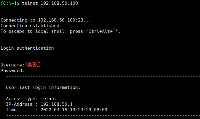 配置用于Telnet登陆的用户名和密码 (Telnet服务默认开启 telnet server enable -----打开telnet服务)