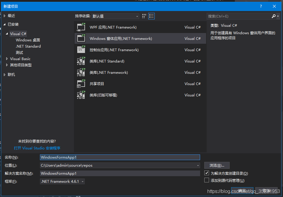 打开VS新建窗体应用就可以了,起个名字,设置路径