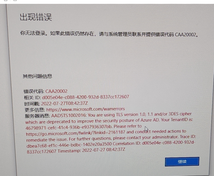 当尝试删除该账号,重新添加到outlook时,无法添加成功,提示错误代码:CAA20002,如下图: