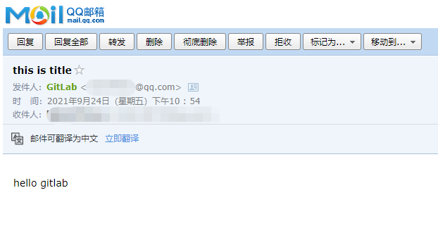 #Notify.test_email('接收方邮件地址','邮件标题','邮件内容').deliver_nowNotify.test_email('xxxxxxxx@qq.com','this is title','hello gitlab').deliver_now