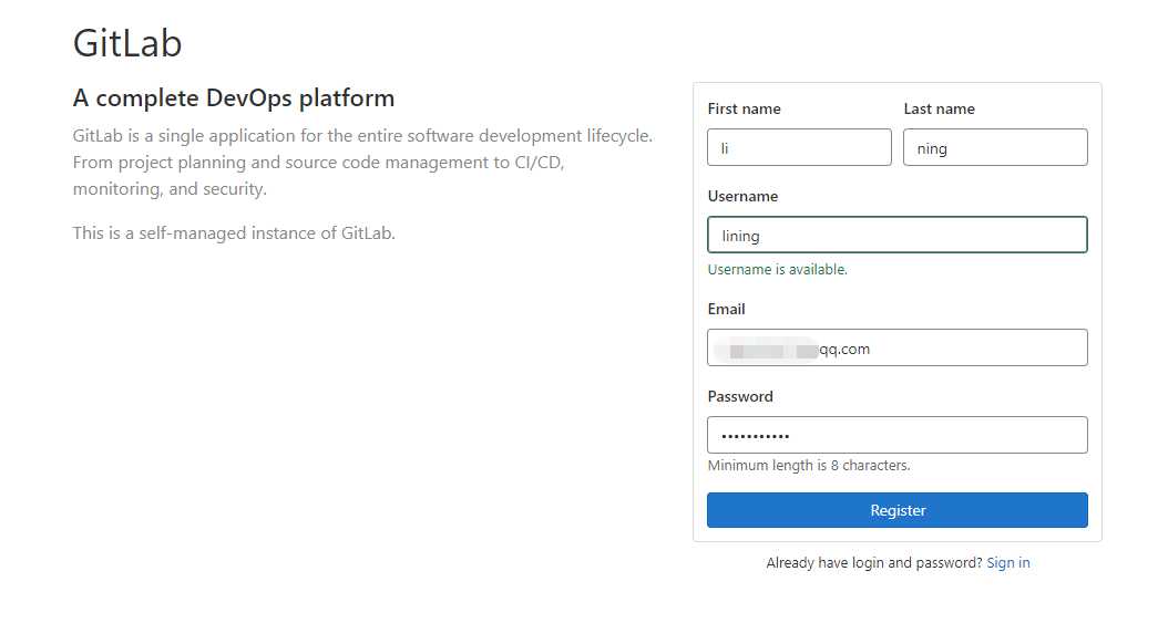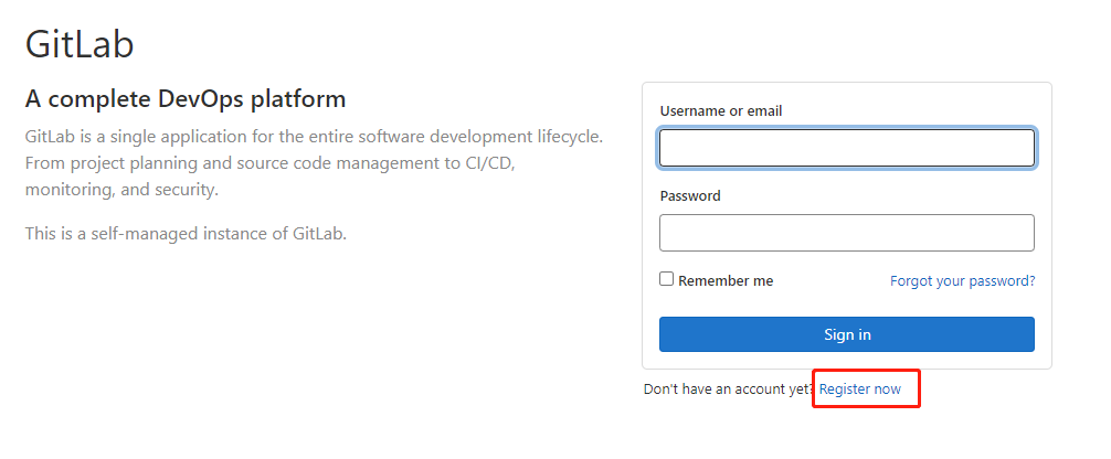 1、搭建好gitLab服务器后,当有新的开发人员需要加入开发时,就可以注册账号了