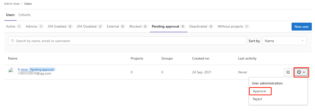 填完信息,点击 Register 后,会发现gitLab的管理员root 账号会收到一个申请通过的请求,点击右边的 Approve ,同意