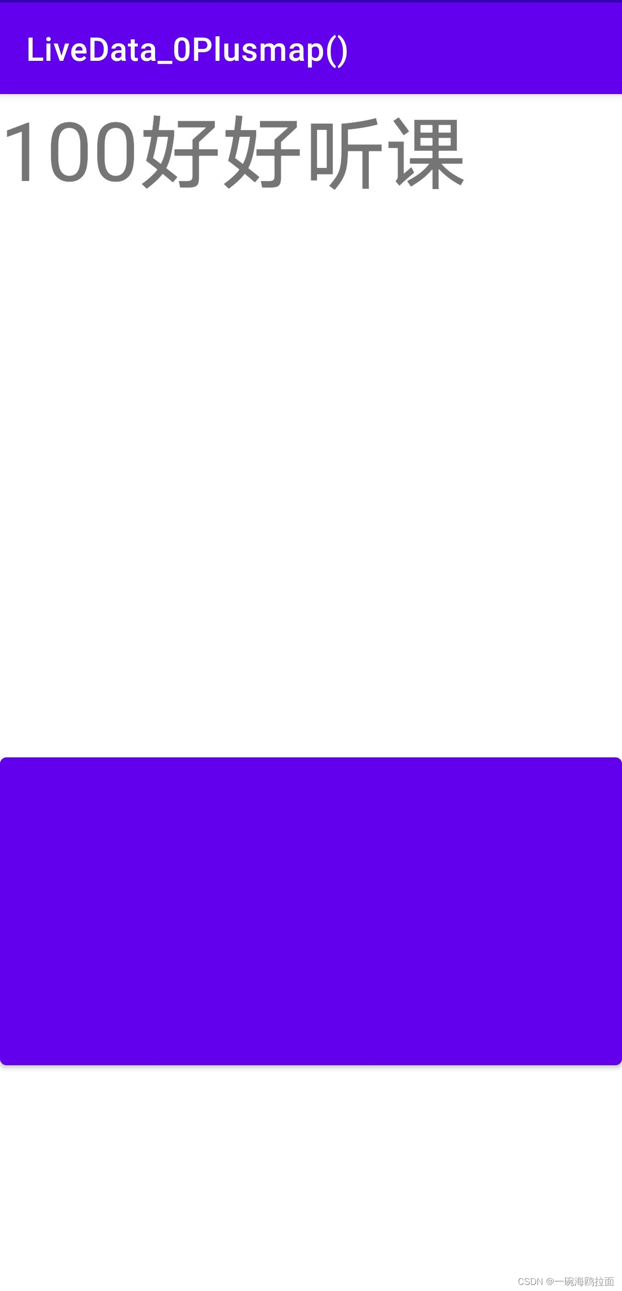 public class MainActivity extends AppCompatActivity {@Overrideprotected void onCreate(Bundle savedInstanceState) {super.onCreate(savedInstanceState);setContentView(R.layout.activity_main);//Integer类型的liveData1MutableLiveData<Integer> liveData1 = new MutableLiveData<>();TextView textView = findViewById(R.id.textview);//转换成String类型的liveDataMapLiveData<String> liveDataMap = Transformations.map(liveData1, new Function<Integer, String>() {@Overridepublic String apply(Integer input) {String s = input + "好好听课";Log.i("TAG", "apply: " + s);return s;}});liveDataMap.observe(this, new Observer<String>() {@Overridepublic void onChanged(String s) {Log.i("TAG", "onChanged1: "+s);textView.setText(s);}});liveData1.setValue(100);}