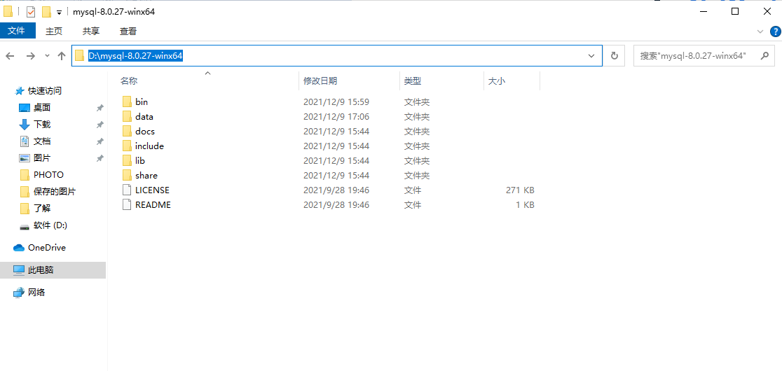 2. 将mysql-8.0.27-winx64文件解压(例如路径为D:\mysql-8.0.27-winx64),如下图
