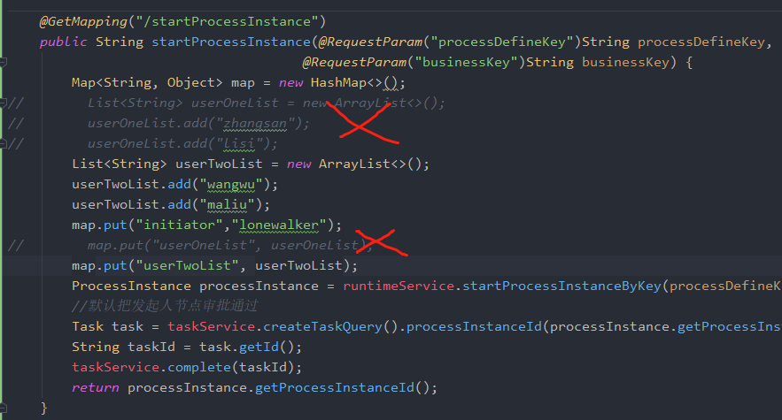 @GetMapping("/startProcessInstance")public String startProcessInstance(@RequestParam("processDefineKey")String processDefineKey,@RequestParam("businessKey")String businessKey) {Map<String, Object> map = new HashMap<>();List<String> userOneList = new ArrayList<>();userOneList.add("zhangsan");userOneList.add("lisi");List<String> userTwoList = new ArrayList<>();userTwoList.add("wangwu");userTwoList.add("maliu");map.put("initiator","lonewalker");map.put("userOneList", userOneList);map.put("userTwoList", userTwoList);ProcessInstance processInstance = runtimeService.startProcessInstanceByKey(processDefineKey, businessKey, map);//默认把发起人节点审批通过Task task = taskService.createTaskQuery().processInstanceId(processInstance.getProcessInstanceId()).singleResult();String taskId = task.getId();taskService.complete(taskId);return processInstance.getProcessInstanceId();}