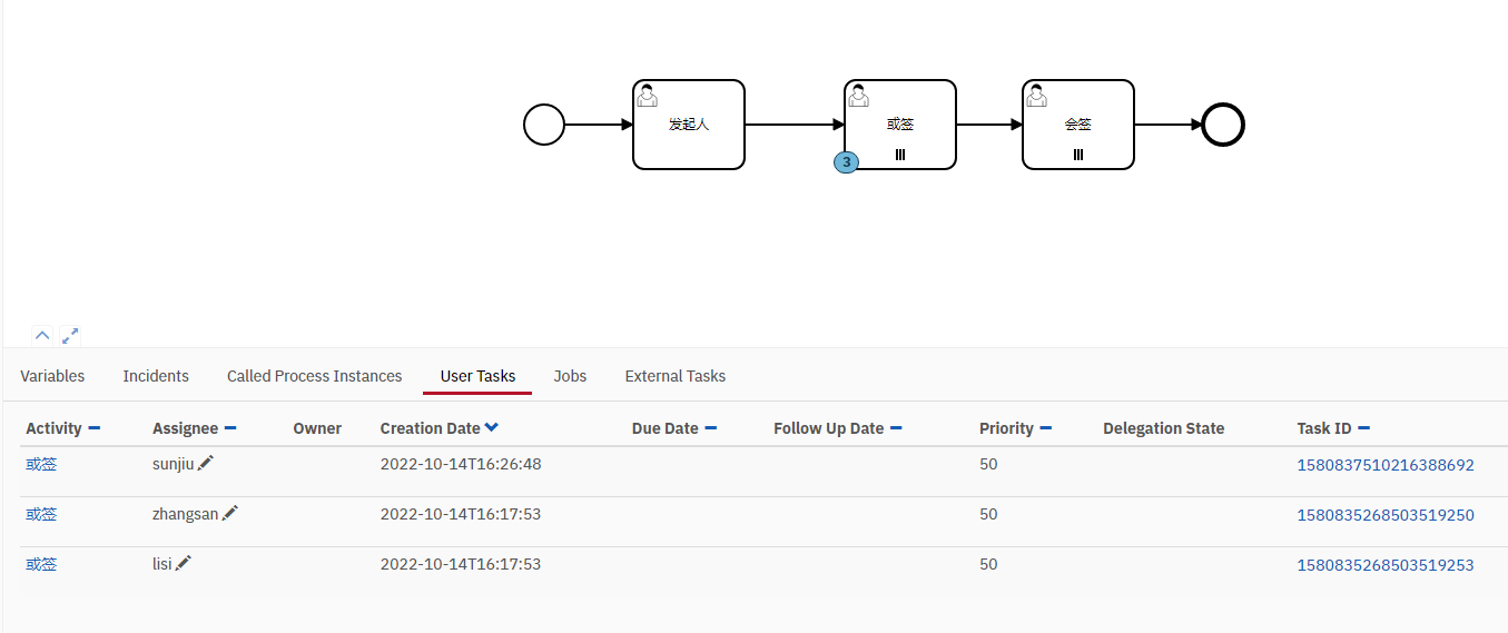 此时我模拟sunjiu审批,因为是或签节点按正常情况,流程会到会签节点,或签节点结束。