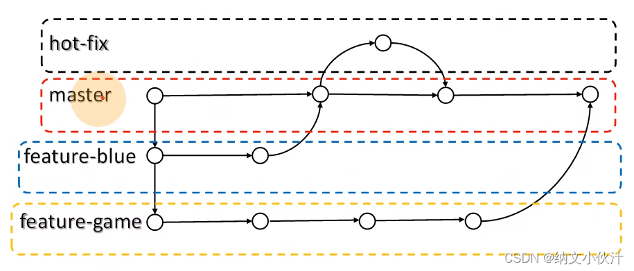 在master主线分支运行时,可以在其他分支下进行开发,开发完毕后,提交至master分支合并。