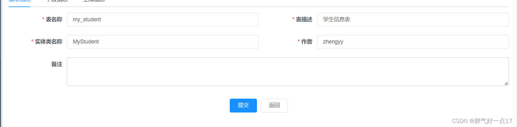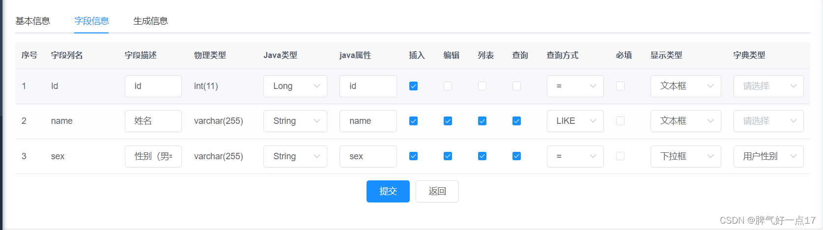 步骤三:进行编辑(基本信息,字段信息,生成信息)