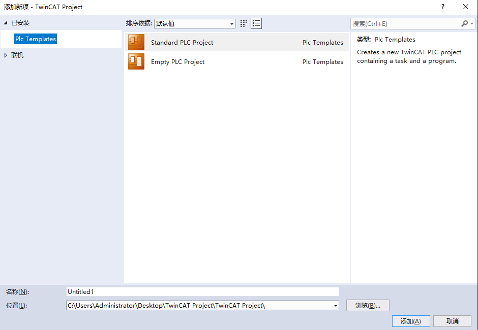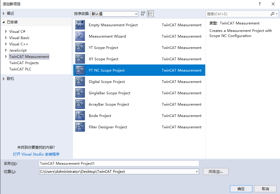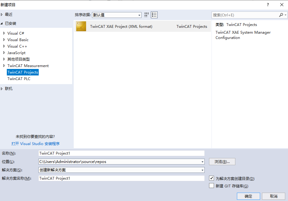 然后打开Visual Studio 2017(TwinCAT3没有单独的应用,是基于VS做的,可以理解为游戏的DLC),会发现新建项目下多了三个TwinCAT的项目,我们选择TwinCAT Projects→TwinCAT XAE Project新建即可,记得不能有中文。