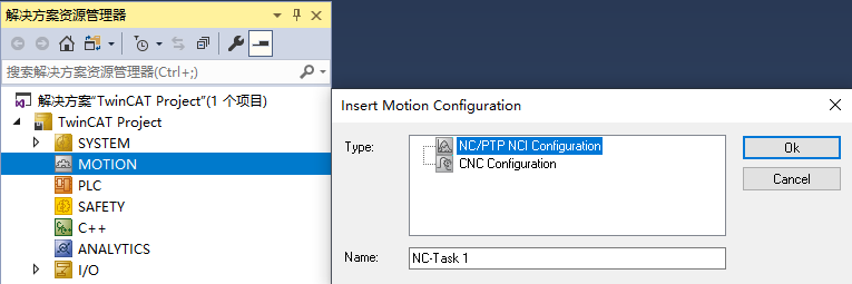首先对MOTION右键添加新项,选择NC/PTP NCI Configuration后Ok。