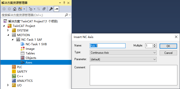然后对Axes右键添加新项,这个轴对应你要控制的电机轴,我这里只添加了一个,如果是多个电机,这里就应该添加多个。