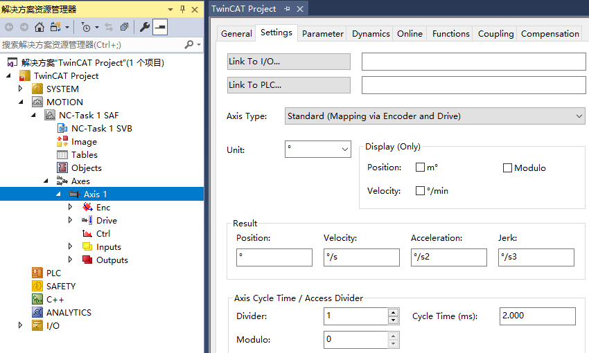 假设我们已经完成后面PLC和I/O的配置,找到Axis 1下的Settings,首先要Link To I/O并Link To PLC,Axis Type也要根据实际情况修改,我用的是EtherCAT通讯,所以这里选的是CANopen DS402/Profile MDP 742,通讯有问题就可以去找DS402通讯协议手册。因为电机的原因我这里Unit是以°为单位,大家根据实际电机种类修改。