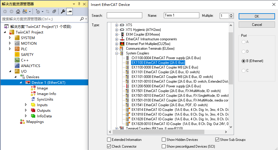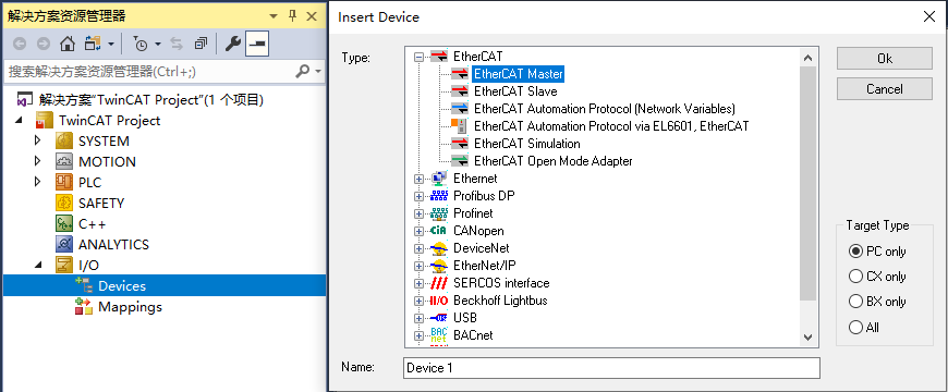 然后对Device 1右键添加新项,Type也要根据实际情况选择,我默认选的EK1100这个。