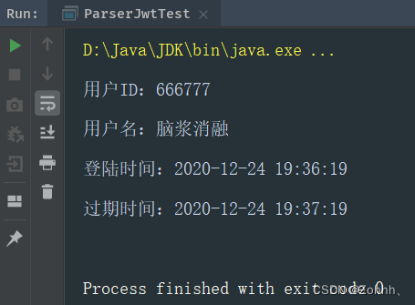public class ParserJwtTest {public static void main(String[] args) {Claims claims = Jwts.parser().setSigningKey("HelloWorld").parseClaimsJws("eyJhbGciOiJIUzI1NiJ9.eyJqdGkiOiI2NjY3NzciLCJzdWIiOiLohJHmtYbmtojono0iLCJpYXQiOjE2MDg4MDk3NzksImV4cCI6MTYwODgwOTgzOX0.kAroSbh6Q5PzoA0iUxNtlpBVipvA6Zb2O3OcEFJkF88").getBody();System.out.println("用户ID:" + claims.getId());System.out.println("用户名:" + claims.getSubject());System.out.println("登陆时间:" + new SimpleDateFormat("yyyy-MM-dd HH:mm:ss").format(claims.getIssuedAt()));System.out.println("过期时间:" + new SimpleDateFormat("yyyy-MM-dd HH:mm:ss").format(claims.getExpiration()));}