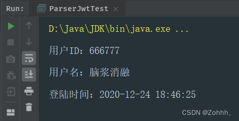 public class ParserJwtTest {public static void main(String[] args) {Claims claims = Jwts.parser().setSigningKey("HelloWorld").parseClaimsJws("eyJhbGciOiJIUzI1NiJ9.eyJqdGkiOiI2NjY3NzciLCJzdWIiOiLohJHmtYbmtojono0iLCJpYXQiOjE2MDg4MDY3ODV9.Da6HfKuSowFkWKmazLzFQSvkWzMPYNCEuNu12Q7e8mM").getBody();System.out.println("用户ID:" + claims.getId());System.out.println("用户名:" + claims.getSubject());System.out.println("登陆时间:" + new SimpleDateFormat("yyyy-MM-dd HH:mm:ss").format(claims.getIssuedAt()));}