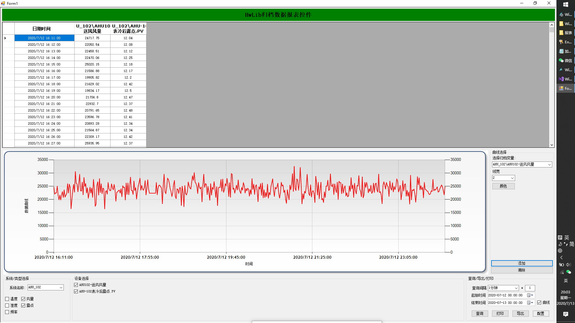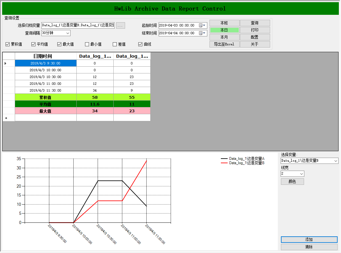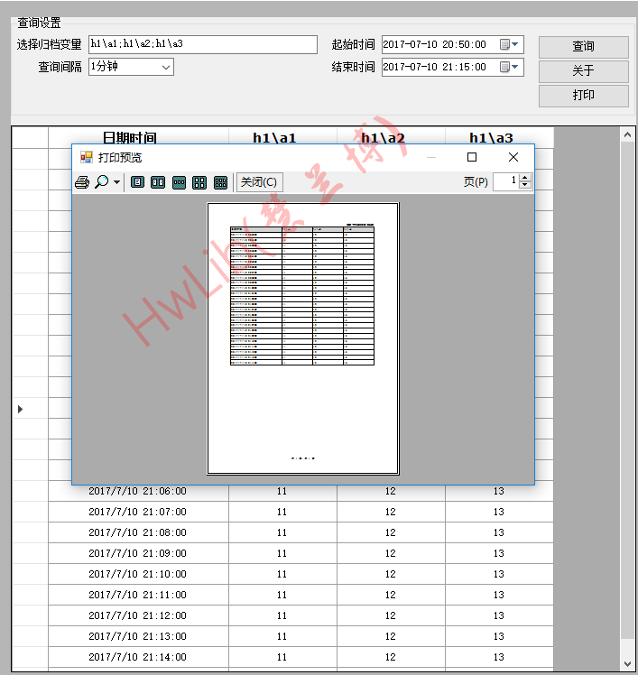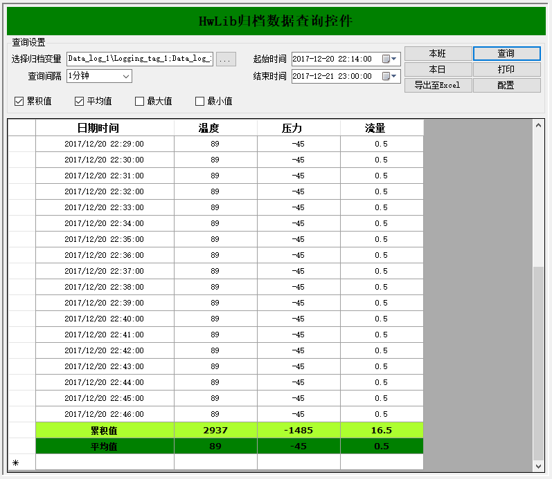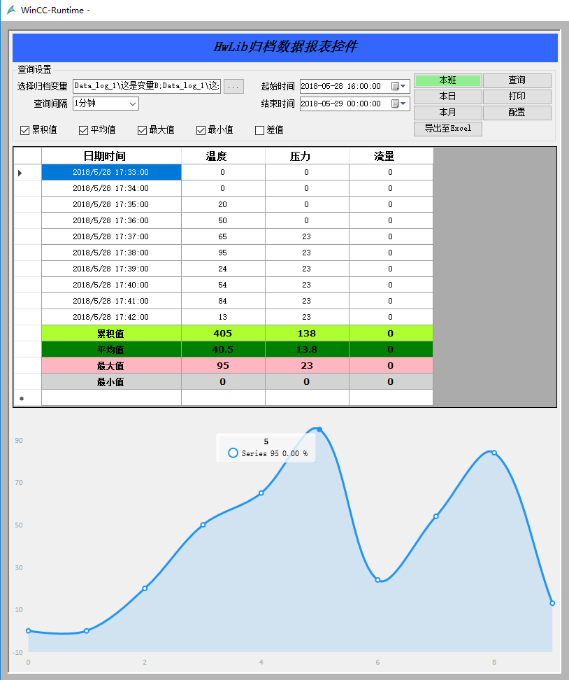 HwDataReport是一个第三方报表控件,它的使用极其简单,你只需将它拖到画面上即可,在运行时通过选择起始时间、结束时间即可显示该时间段内的数据。通过查询时间间隔可以设置读到报表中的数据间隔时间,比如取一分钟的平均值、10分钟的平均值或是1小时的平均值等,可以很容易的形成日报表、班报表及月报表等等。所有功能无需一行脚本代码即可完成。