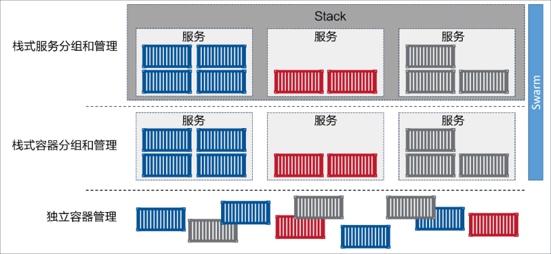 从体系结构上来讲,Stack 位于 Docker 应用层级的最顶端。Stack 基于服务进行构建,而服务又基于容器,如下图所示。