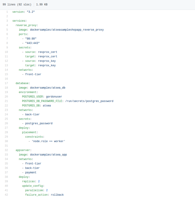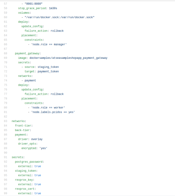 最后,Stack 文件中有 4 个密钥,分别为“postgres_password”“staging_token”“revprox_key”“revprox_cert”。这是在访问https://github.com/dockersamples/atsea-sample-shop-app.git里面的docker-stack.yml的内容。