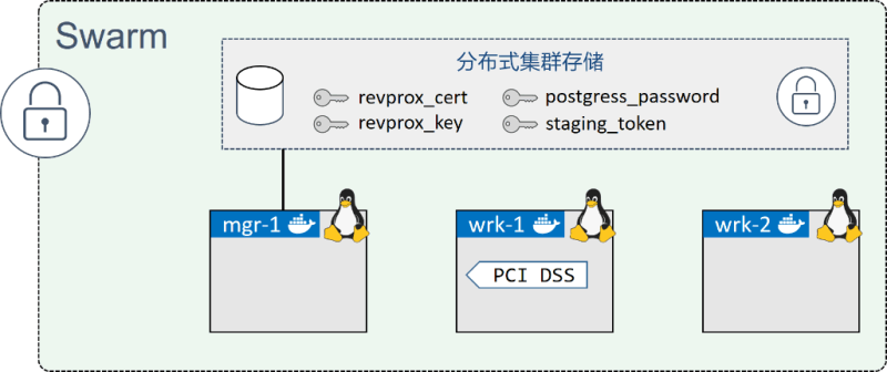 Swarm 集群目前就绪。payment_gateway 服务配置了部署约束,限制该服务只能运行在有 pcidss=yes 标签的工作节点之上。本步骤中将在 wrk-1 上添加该节点标签。
