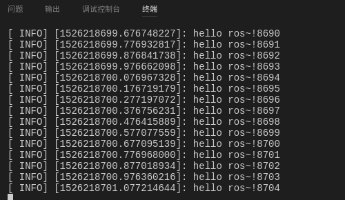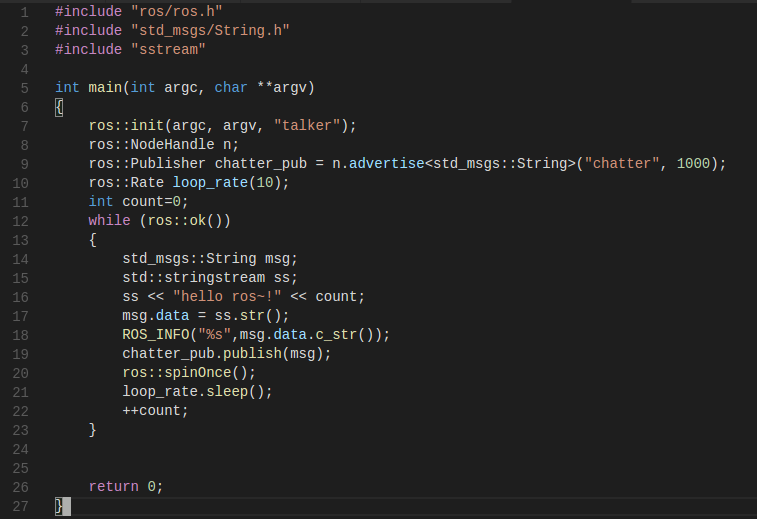 {ros::init(argc, argv, "talker");ros::NodeHandle n;ros::Publisher chatter_pub = n.advertise<std_msgs::String>("chatter", 1000);ros::Rate loop_rate(10);int count=0;while (ros::ok()){std_msgs::String msg;std::stringstream ss;ss << "hello ros~!" << count;msg.data = ss.str();ROS_INFO("%s",msg.data.c_str());chatter_pub.publish(msg);ros::spinOnce();loop_rate.sleep();++count;}return 0;