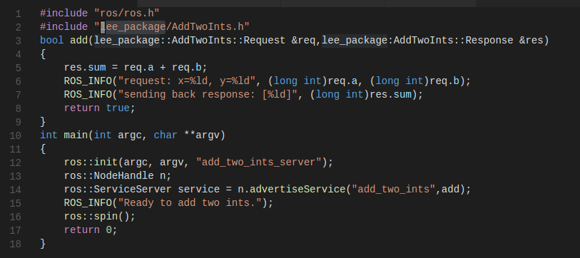 {res.sum = req.a + req.b;ROS_INFO("request: x=%ld, y=%ld", (long int)req.a, (long int)req.b);ROS_INFO("sending back response: [%ld]", (long int)res.sum);return true;