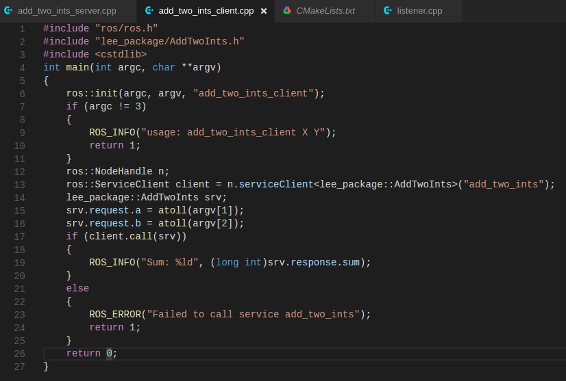 {ros::init(argc, argv, "add_two_ints_client");if (argc != 3){ROS_INFO("usage: add_two_ints_client X Y");return 1;}ros::NodeHandle n;ros::ServiceClient client = n.serviceClient<lee_package::AddTwoInts>("add_two_ints");lee_package::AddTwoInts srv;srv.request.a = atoll(argv[1]);srv.request.b = atoll(argv[2]);if (client.call(srv)){ROS_INFO("Sum: %ld", (long int)srv.response.sum);}else{ROS_ERROR("Failed to call service add_two_ints");return 1;}return 0;