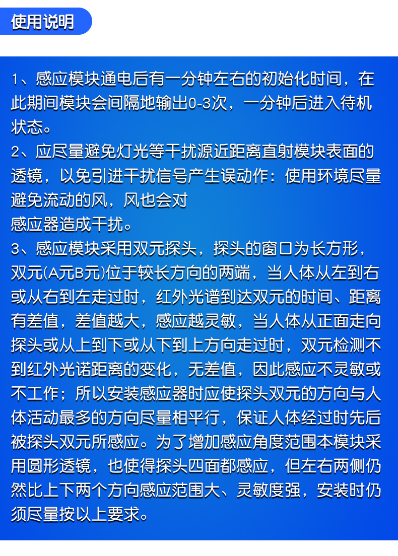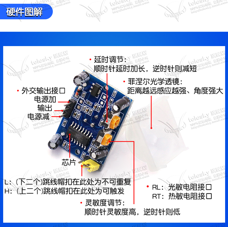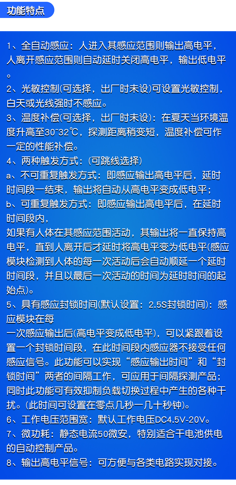 1)理解两种触发方式:可重复触发和不可重复触发 2)学会调节两个属性:延迟调节和灵敏度调节 (在不同触发方式下,大家要自己调自己的设备,不同延迟反应快速性不同,不同灵敏度感应的范围不同) 3)注意刚上电会有一段初始化时间