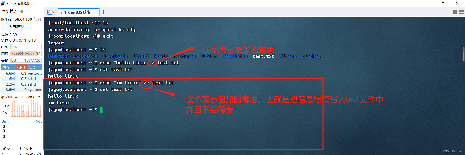 >>,表示追加输出