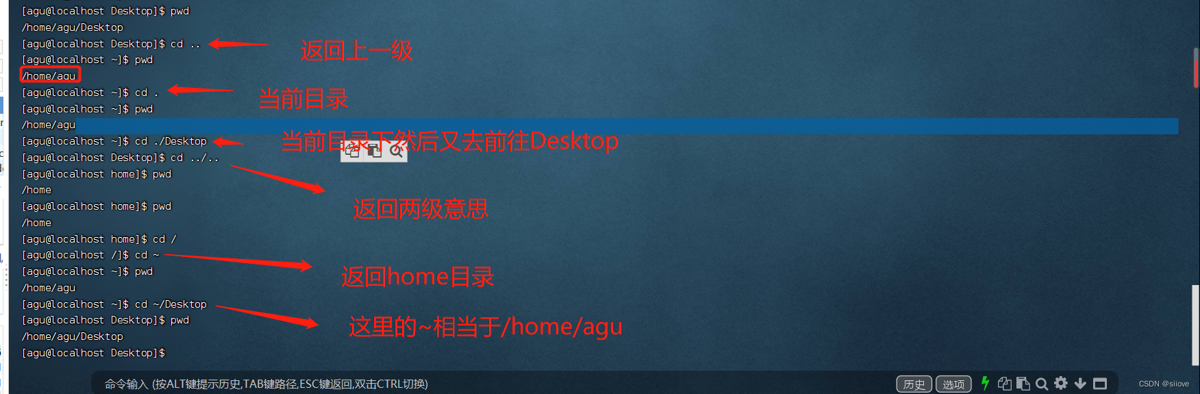 - ~ 表示HOME目录,比如:cd ~ 即可切换到HOME目录或cd ~/Desktop,切换到HOME内的Desktop目录