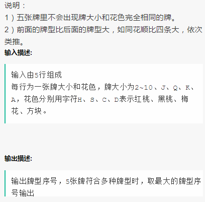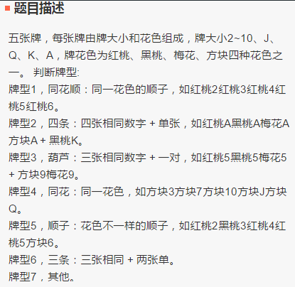 {if (num34(3)){char c;for (int i = 0; i < 5; i++){c = num[i];int s = 0;for (int i = 0; i < 5; i++)if (num[i] == c)s++;if (s == 1)return 6;}return 3;}if (num34(4))return 2;if (shun()){if (tonghua())return 1;return 5;}if (tonghua())return 4;return 7;