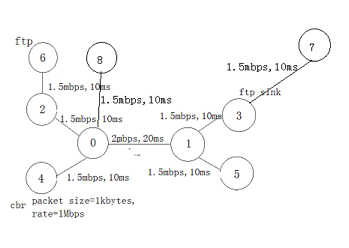 在ubuntu环境下,通过学习示例文件编写TCL脚本,搭建如下图所示的一个网络,共6个节点,其中2、3节点用做ftp服务器和客户端,4、5节点用做cbr流量的源和目的,而0、1节点用做转发设备。各节点间的链路属性见图。