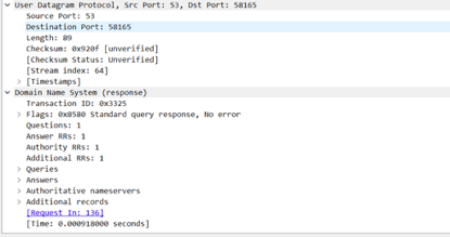 - 针对(1)中的DNS访问过程,观察UDP协议的报文格式。