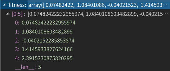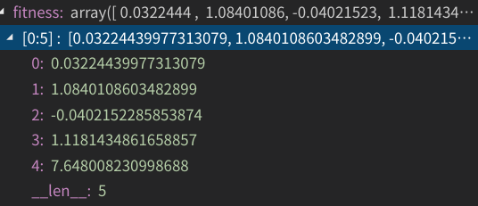 我们从中挑出最好的并记录下来,我们可以看到,最好的适应值为下标4对应的点,为7.648。