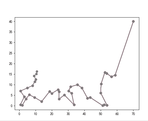 class Individual:def __init__(self, genes=None):# 随机生成序列if genes is None:genes = [i for i in range(gene_len)]random.shuffle(genes)self.genes = genesself.fitness = self.evaluate_fitness()def evaluate_fitness(self):# 计算个体适应度fitness = 0.0for i in range(gene_len - 1):# 起始城市和目标城市from_idx = self.genes[i]to_idx = self.genes[i + 1]fitness += city_dist_mat[from_idx, to_idx]# 连接首尾fitness += city_dist_mat[self.genes[-1], self.genes[0]]return fitnessclass Ga:def __init__(self, input_):global city_dist_matcity_dist_mat = input_self.best = None # 每一代的最佳个体self.individual_list = [] # 每一代的个体列表self.result_list = [] # 每一代对应的解self.fitness_list = [] # 每一代对应的适应度def cross(self):new_gen = []random.shuffle(self.individual_list)for i in range(0, individual_num - 1, 2):# 父代基因genes1 = copy_list(self.individual_list[i].genes)genes2 = copy_list(self.individual_list[i + 1].genes)index1 = random.randint(0, gene_len - 2)index2 = random.randint(index1, gene_len - 1)pos1_recorder = {value: idx for idx, value in enumerate(genes1)}pos2_recorder = {value: idx for idx, value in enumerate(genes2)}# 交叉for j in range(index1, index2):value1, value2 = genes1[j], genes2[j]pos1, pos2 = pos1_recorder[value2], pos2_recorder[value1]genes1[j], genes1[pos1] = genes1[pos1], genes1[j]genes2[j], genes2[pos2] = genes2[pos2], genes2[j]pos1_recorder[value1], pos1_recorder[value2] = pos1, jpos2_recorder[value1], pos2_recorder[value2] = j, pos2new_gen.append(Individual(genes1))new_gen.append(Individual(genes2))return new_gendef mutate(self, new_gen):for individual in new_gen:if random.random() < mutate_prob:# 翻转切片old_genes = copy_list(individual.genes)index1 = random.randint(0, gene_len - 2)index2 = random.randint(index1, gene_len - 1)genes_mutate = old_genes[index1:index2]genes_mutate.reverse()individual.genes = old_genes[:index1] + genes_mutate + old_genes[index2:]# 两代合并self.individual_list += new_gendef select(self):# 锦标赛group_num = 10 # 小组数group_size = 10 # 每小组人数group_winner = individual_num // group_num # 每小组获胜人数winners = [] # 锦标赛结果for i in range(group_num):group = []for j in range(group_size):# 随机组成小组player = random.choice(self.individual_list)player = Individual(player.genes)group.append(player)group = Ga.rank(group)# 取出获胜者winners += group[:group_winner]self.individual_list = winners@staticmethoddef rank(group):# 冒泡排序for i in range(1, len(group)):for j in range(0, len(group) - i):if group[j].fitness > group[j + 1].fitness:group[j], group[j + 1] = group[j + 1], group[j]return groupdef next_gen(self):# 交叉new_gen = self.cross()# 变异self.mutate(new_gen)# 选择self.select()# 获得这一代的结果for individual in self.individual_list:if individual.fitness < self.best.fitness:self.best = individualdef train(self):# 初代种群self.individual_list = [Individual() for _ in range(individual_num)]self.best = self.individual_list[0]# 迭代# plt.figure()# plt.ion()for i in range(gen_num):self.next_gen()# 连接首尾result = copy_list(self.best.genes)result.append(result[0])self.result_list.append(result)self.fitness_list.append(self.best.fitness)# plt.plot(self.fitness_list)# plt.pause(0.01)# plt.title(u"适应度曲线")# plt.legend()return self.result_list, self.fitness_listif __name__ == '__main__':Start = time.time()# 城市坐标# 读取数据city_pos_list = np.loadtxt(r'D:\86176\PycharmProjects\pythonProject\sj.txt', dtype=np.float32)city_pos_list = np.vstack([city_pos_list[:, [2 * i, 2 * i + 1]]for i in range(4)])d0 = np.array([70, 40])city_pos_list = np.vstack([d0, city_pos_list])# 城市距离矩阵city_dist_mat = dist_ance(city_pos_list)# print(city_pos_list)# print(city_dist_mat)# 遗传算法运行ga = Ga(city_dist_mat)result_list, fitness_list = ga.train()result = result_list[-1]idx = result.index(0)result = result[idx:-1]result.extend(result_list[-1][:idx])result.append(0)result_pos_list = city_pos_list[result, :]# fig = plt.figure()# plt.plot(result_pos_list[:, 0], result_pos_list[:, 1], 'o-r')# plt.title(u"路线")# plt.legend()# fig.show()# 画图# plt.figure()# plt.ion()# # plt.plot(fitness_list)# xx = [fitness_list[0]]# for i in range(1, len(fitness_list)):# xx.append(fitness_list[i])# plt.plot(xx)# plt.pause(0.01)# plt.title(u"适应度曲线")# plt.legend()# plt.show()plt.figure()plt.ion()xs = [result_pos_list[0, 0]]ys = [result_pos_list[0, 1]]for i in range(1, len(result_pos_list)):xs.append(result_pos_list[i, 0])ys.append(result_pos_list[i, 1])plt.plot(xs, ys, '-o')plt.pause(0.1)End = time.time()print("用时", End - Start, '秒')print('运行路线为:')for i in result:print(i, end=' ')print("\n最短总距离为:", fitness_list[-1])