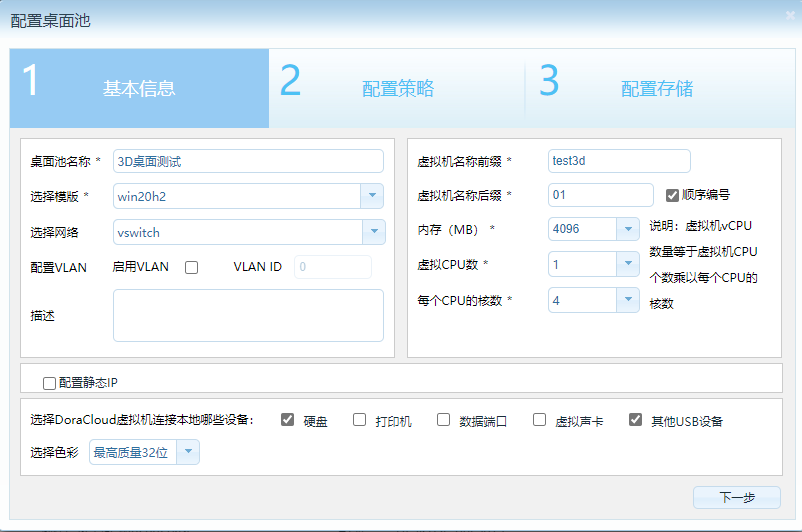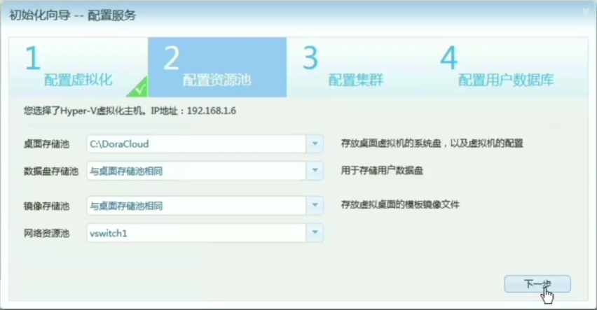 配置资源池,包括桌面存储池、数据盘存储池、镜像存储池、网络资源池。