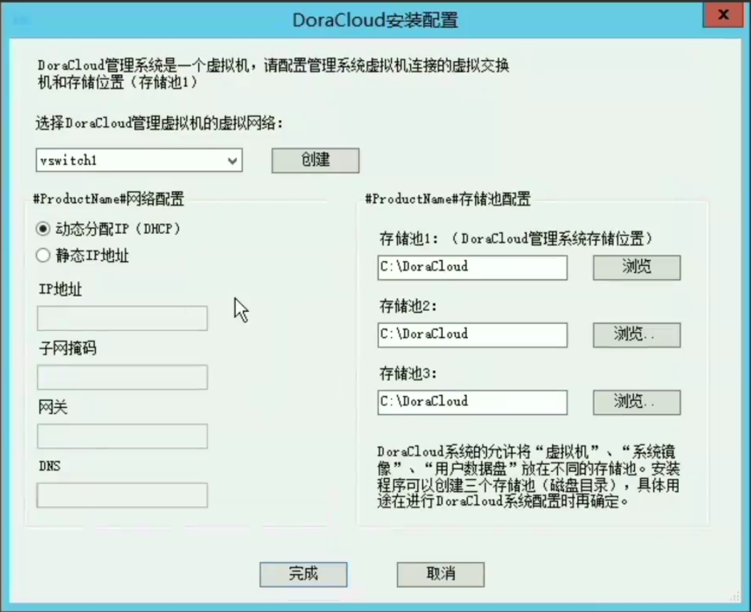 运行DoraCloud安装程序,不要使用默认交换机 Default Switch。Default Switch是NAT模式的虚拟交换机。 需要另外创建一个虚拟交换机,采用与现有网卡采用桥接模式。 这样虚拟机可以分配到局域网的IP地址。