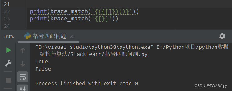 def brace_match(s):match = {'}': "{", "]": "[", ")": "("}stack = Stack()for ch in s:if ch in {"(", "{", "["}:stack.push(ch)else:if stack.is_empty():return Falseelif stack.get_top() == match[ch]:stack.pop()else:return Falseif stack.is_empty():return Trueelse:return False