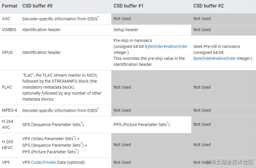 Android 使用以下特定于编解码器的数据缓冲区,为了正确配置 MediaMuxer 轨道,还需要将它们设置为轨道格式,每个参数集和标有(*)的编解码器专用数据部分必须以“ \ x00 \ x00 \ x00 \ x01”的起始代码开头,参考如下: