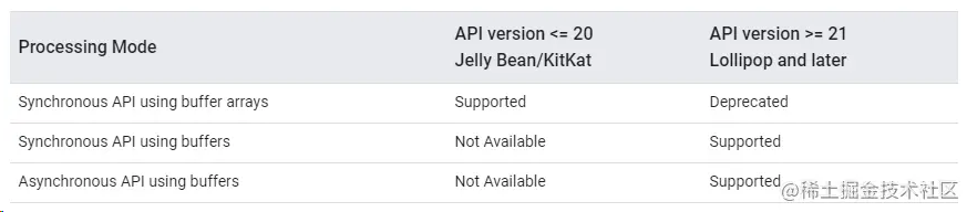 每个创建已经创建的编解码器都维护一组输入缓冲区,有两种处理数据的方式,同步和异步方式,根据 API 版本不同有所区别,在 API 21 也就是从 Android5.0 开始,推荐使用 ButeBuffer 的方式进行数据的处理,在此之前只能使用 ButeBuffer 数组的方式进行数据的处理,如下: